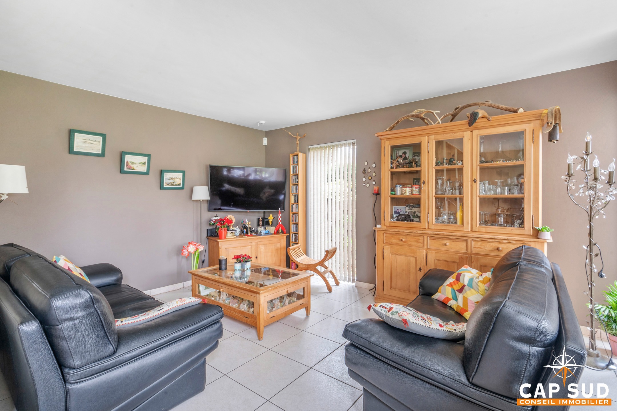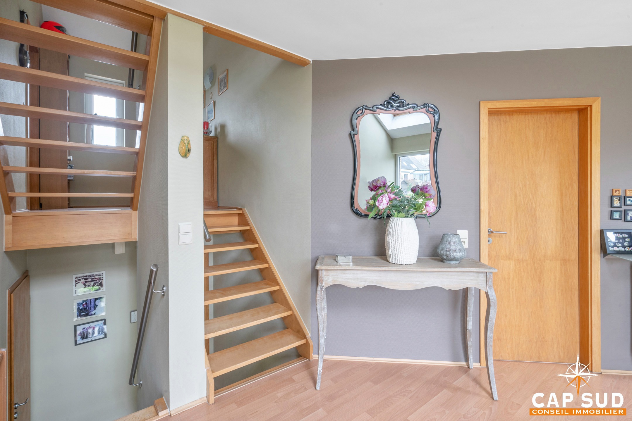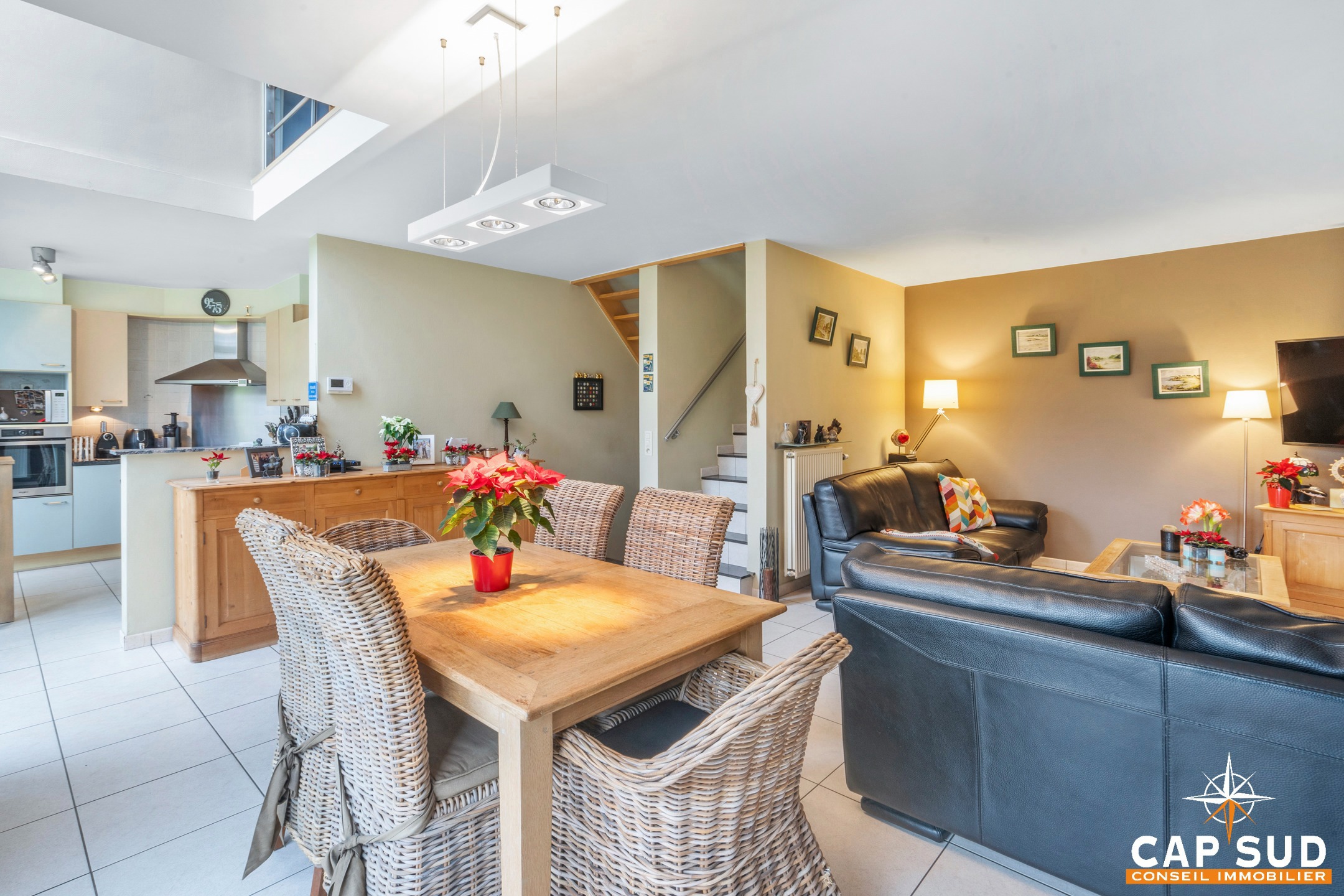 Au rez-de-chaussée, le hall d’entrée dessert d’une part, un lumineux séjour ainsi qu’une cuisine ouverte et d’autre part, un garage et un accès à trois caves.