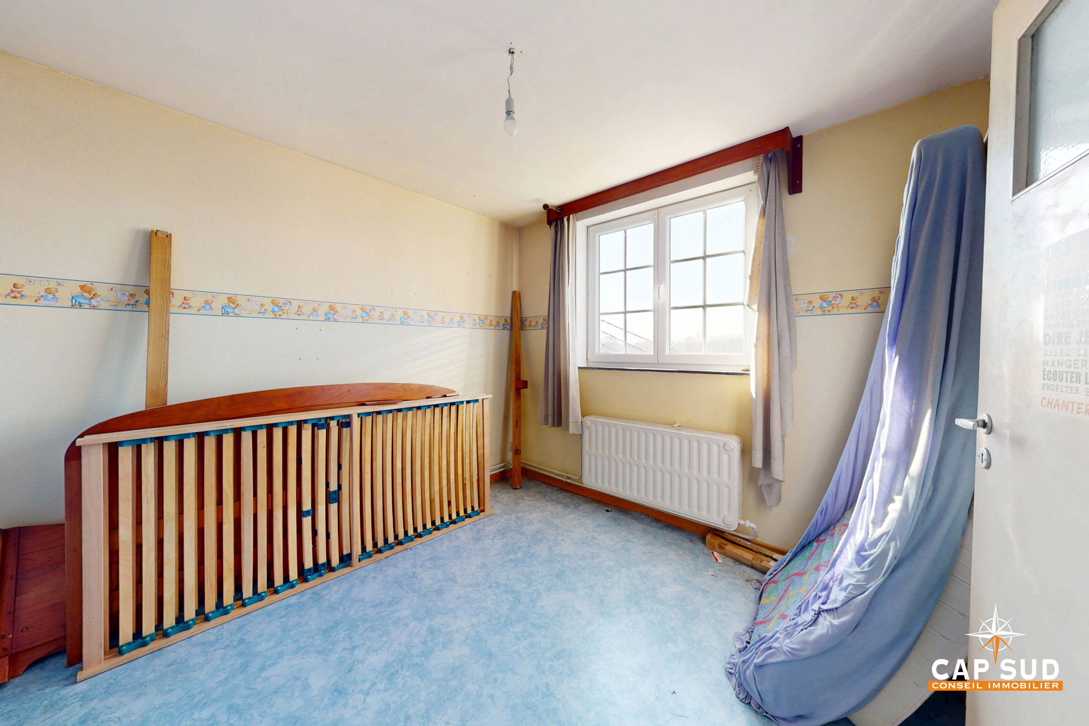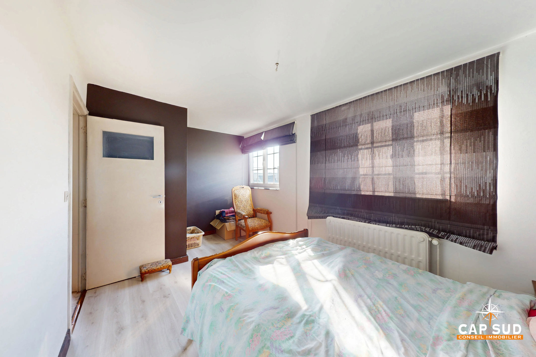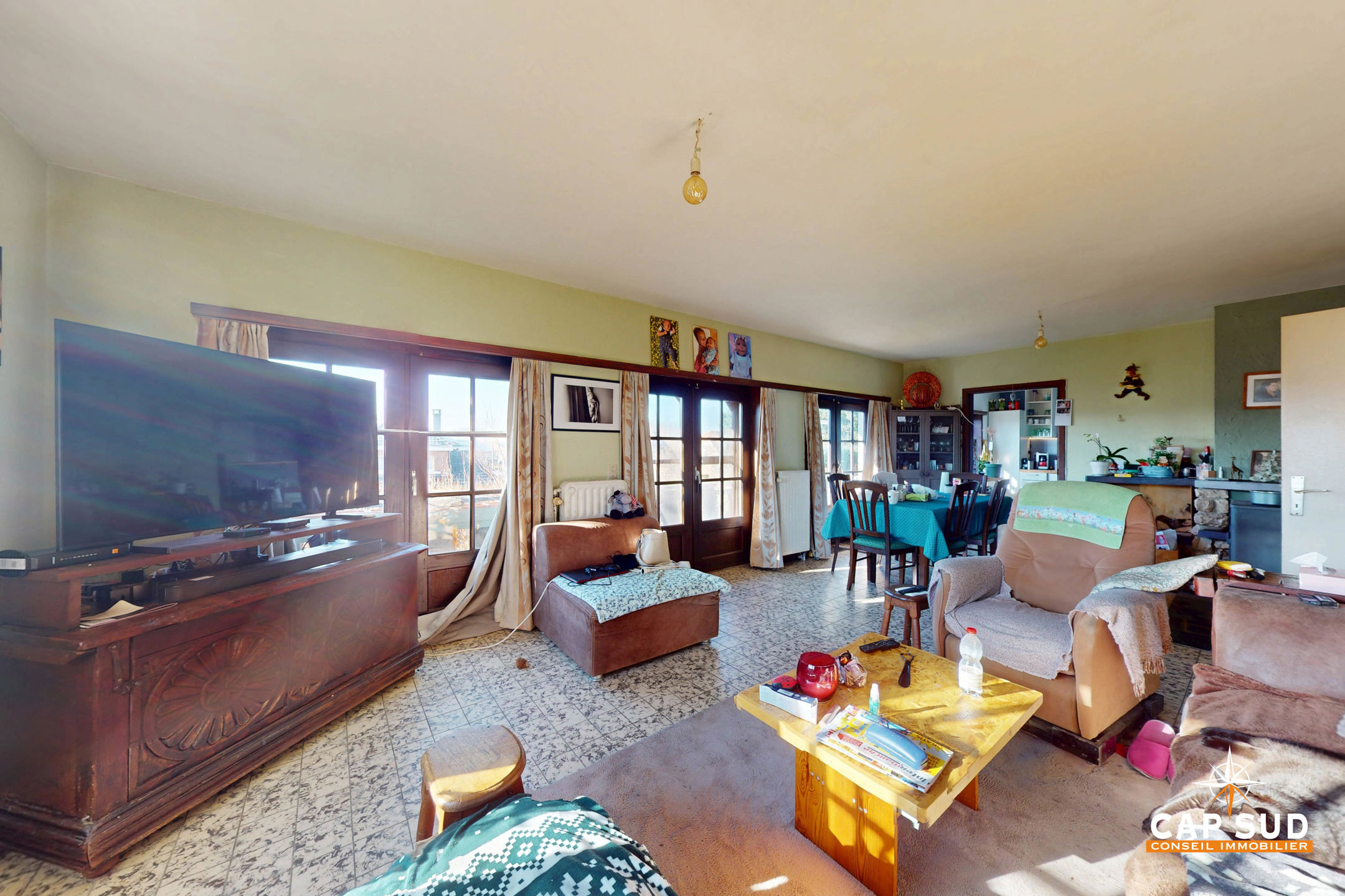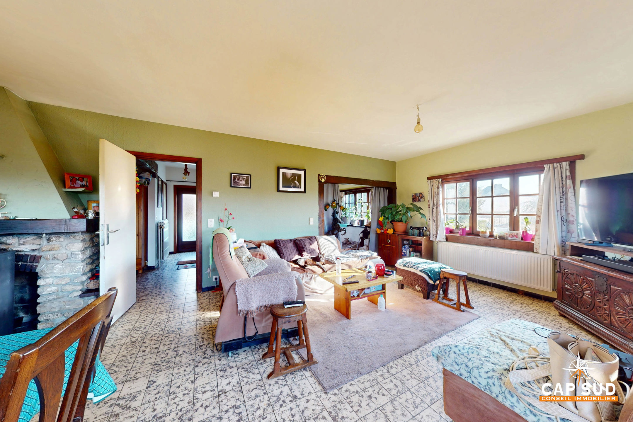 Le rez-de-chaussée comprend un séjour lumineux avec un accès direct à une grande terrasse extérieure, un bureau, une cuisine à rénover, une buanderie, un WC séparé. L’étage se compose de 5 chambres et d’une salle de bain.