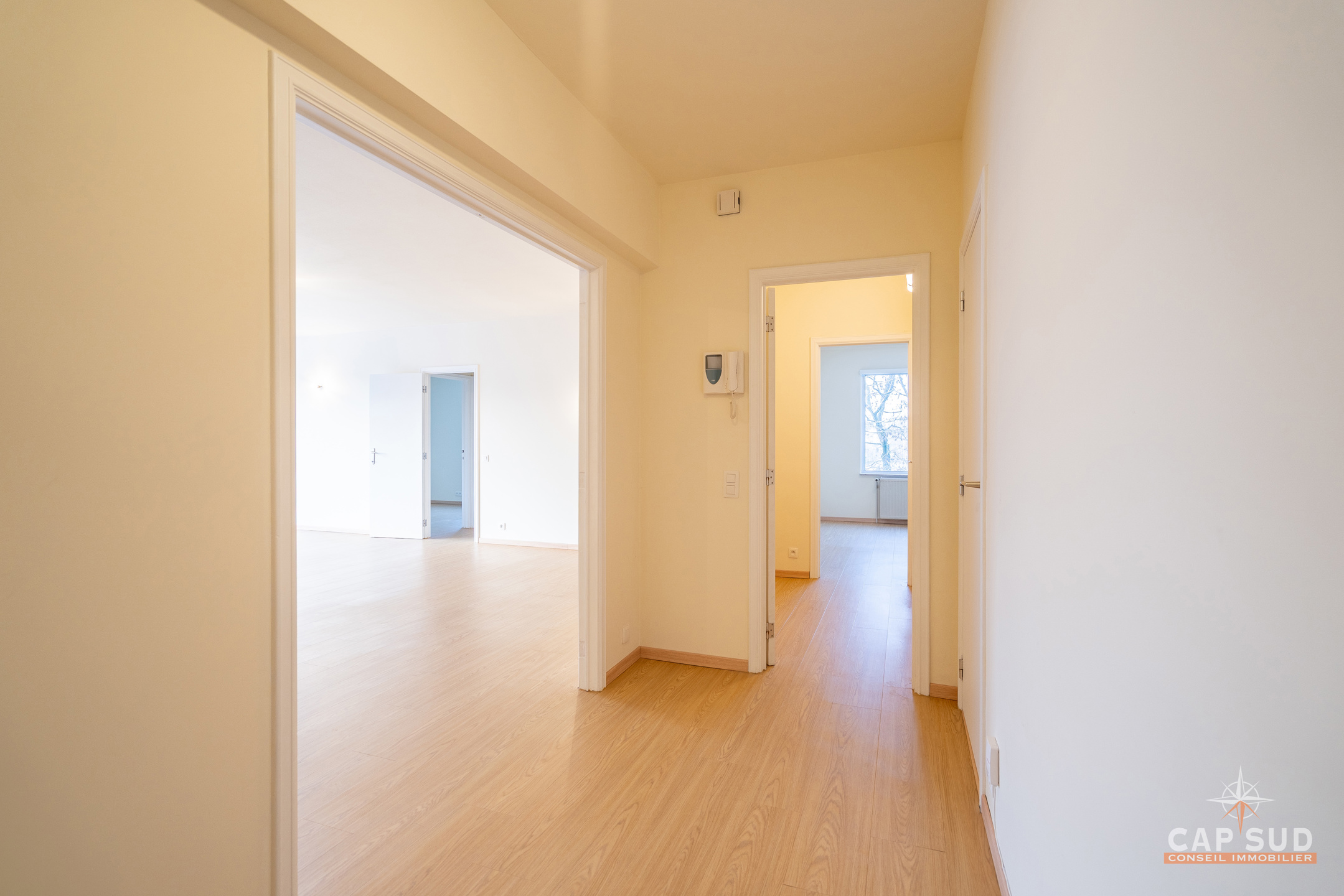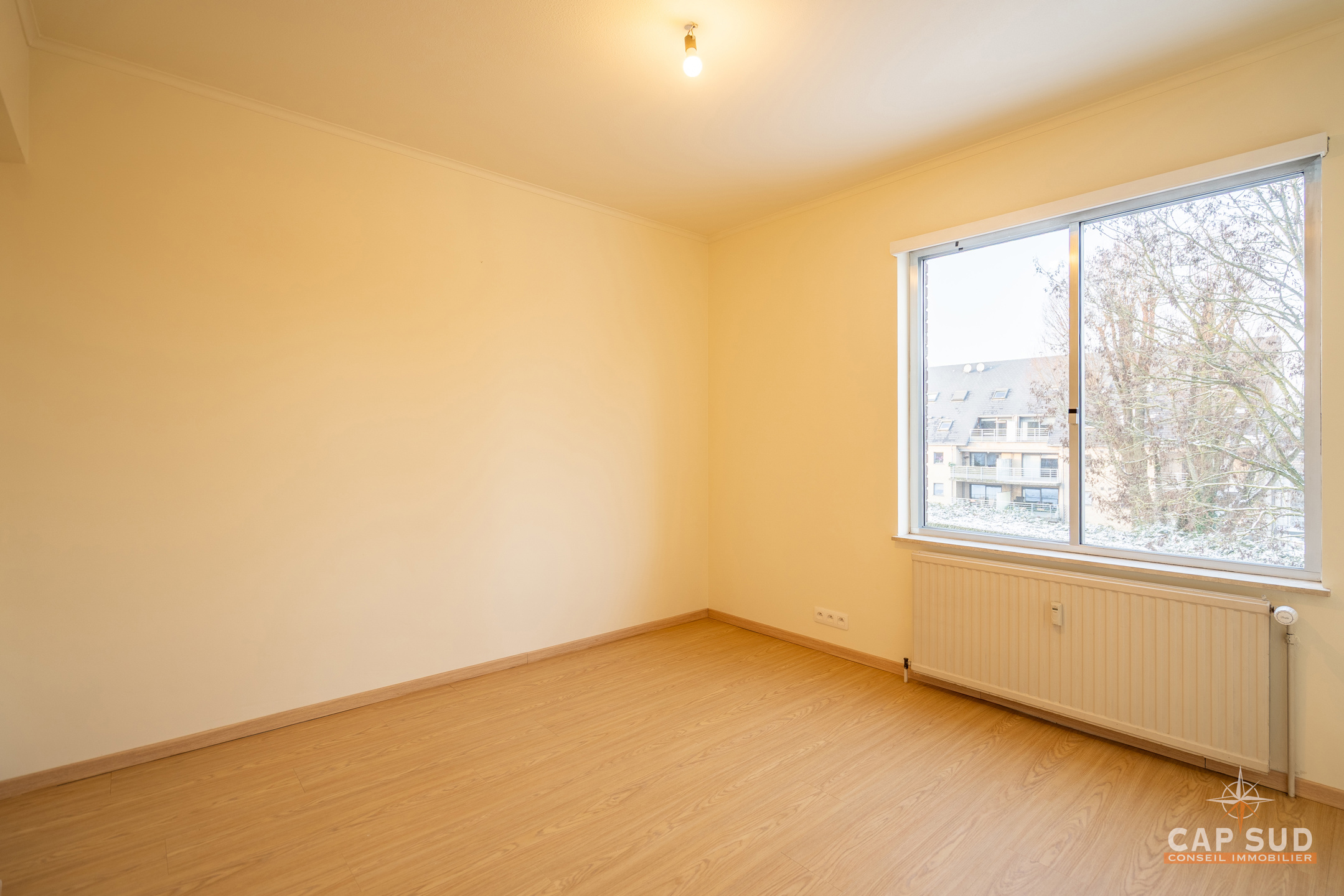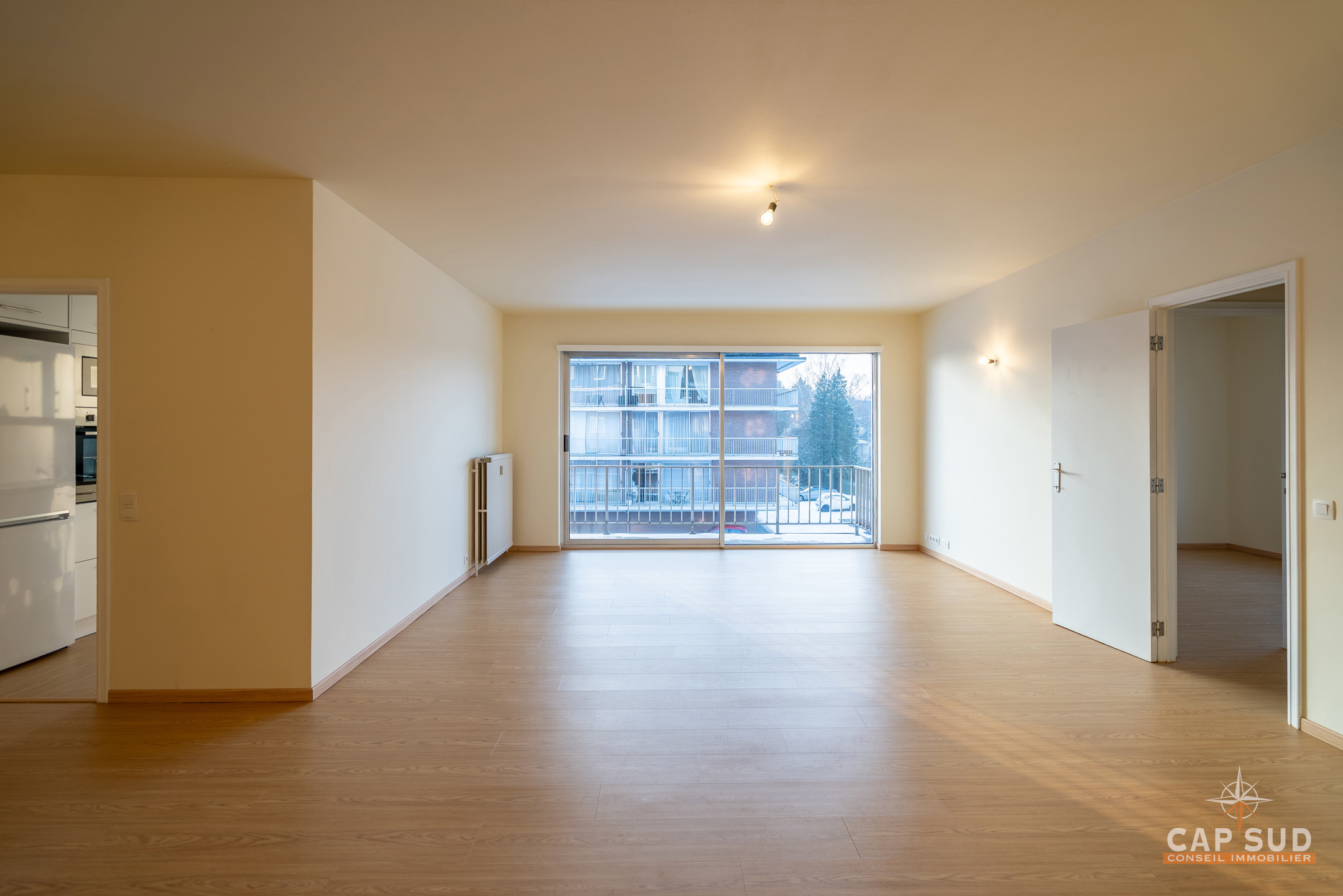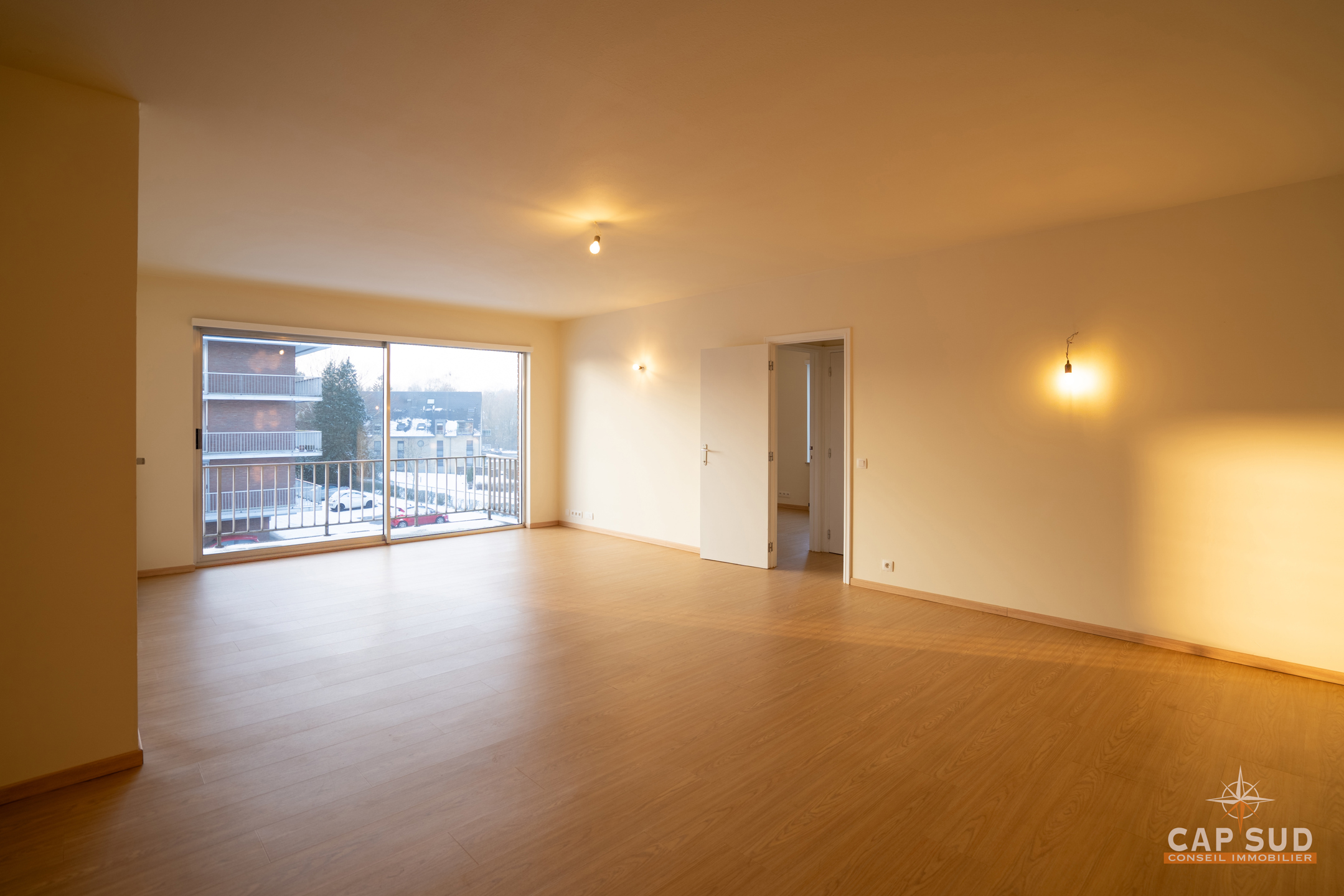L’appartement se compose d’un hall d’entrée, de deux WC séparés, d’un agréable séjour d’environ 43 m² donnant accès à une terrasse de ± 8 m² exposée sud-ouest, d’une cuisine entièrement équipée, de trois chambres de ± 11 m², 11 m² et 13 m², ainsi que d’une salle de douche.